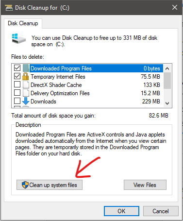 Wait! don’t click on OK button, instead click on the “Clean up system files” button. And let Windows search for the old windows backup. See the screenshot below.